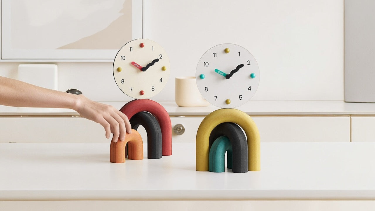 Minimal, sculptural, and colorful—our arch clocks bring personality to any desk or shelf.